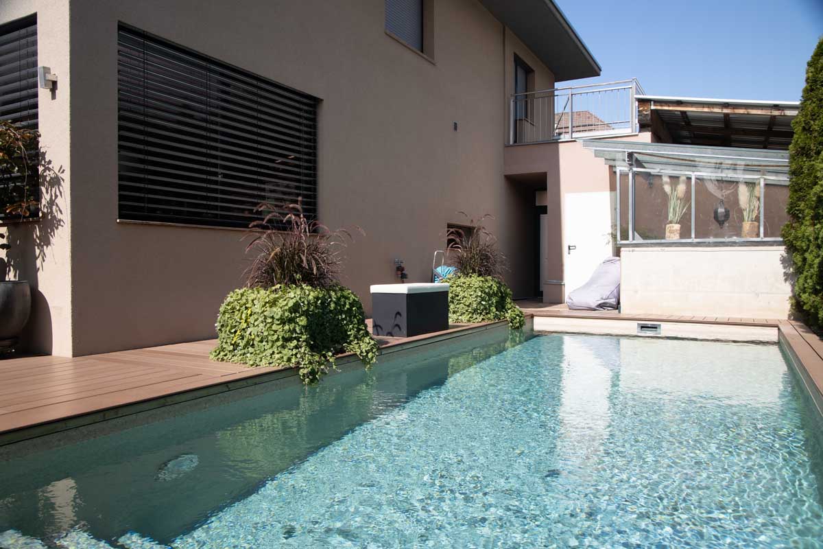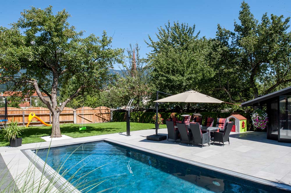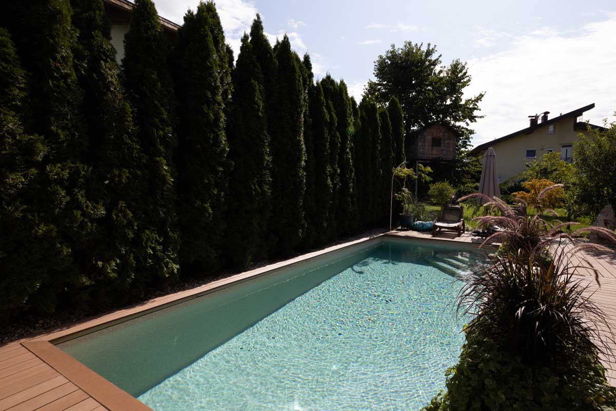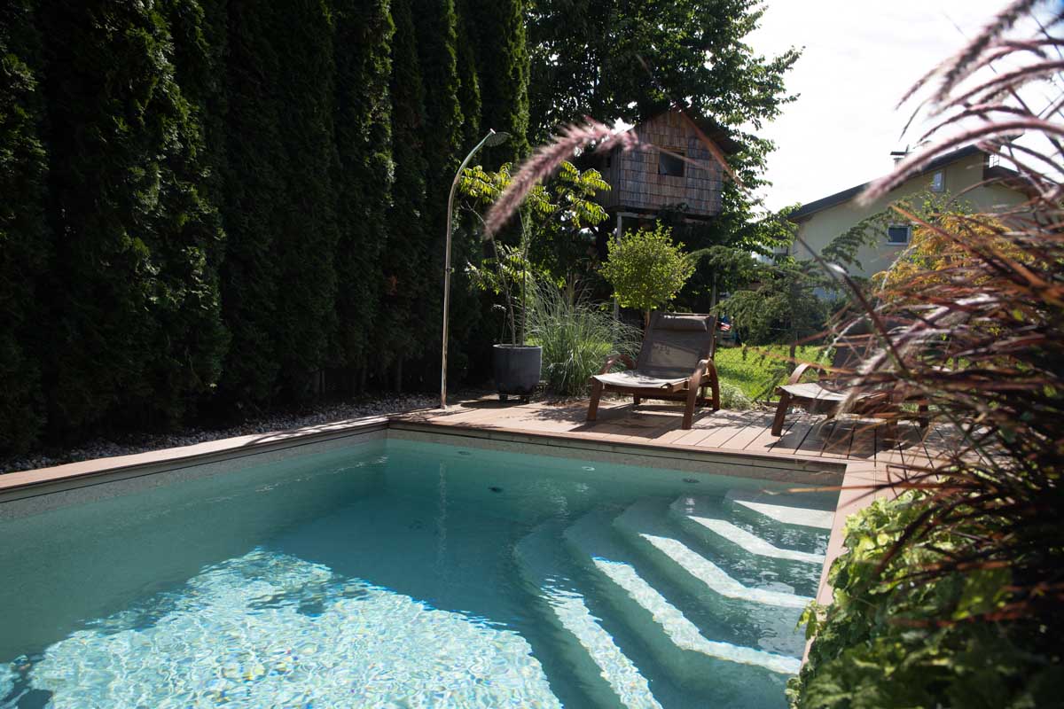 So unterschiedlich, wie Menschen sind, so sehr unterscheiden sich auch ihre Prioritäten, wenn es um das Aussehen eines Schwimmbeckens geht. Während der eine hauptsächlich lange Bahnen schwimmen möchte und daher einen eher ein schmales Becken bevorzugt, möchte der andere den Kindern und Freunden Platz für Spiel und Spaß bieten. Dazu können auch Zusatzausstattungen gehören wie zum Beispiel ein Wasserfall oder die Solardusche. In unserer Galerie sehen Sie auch, wie die Ein- und Ausstiegstreppe gestaltet sein kann.